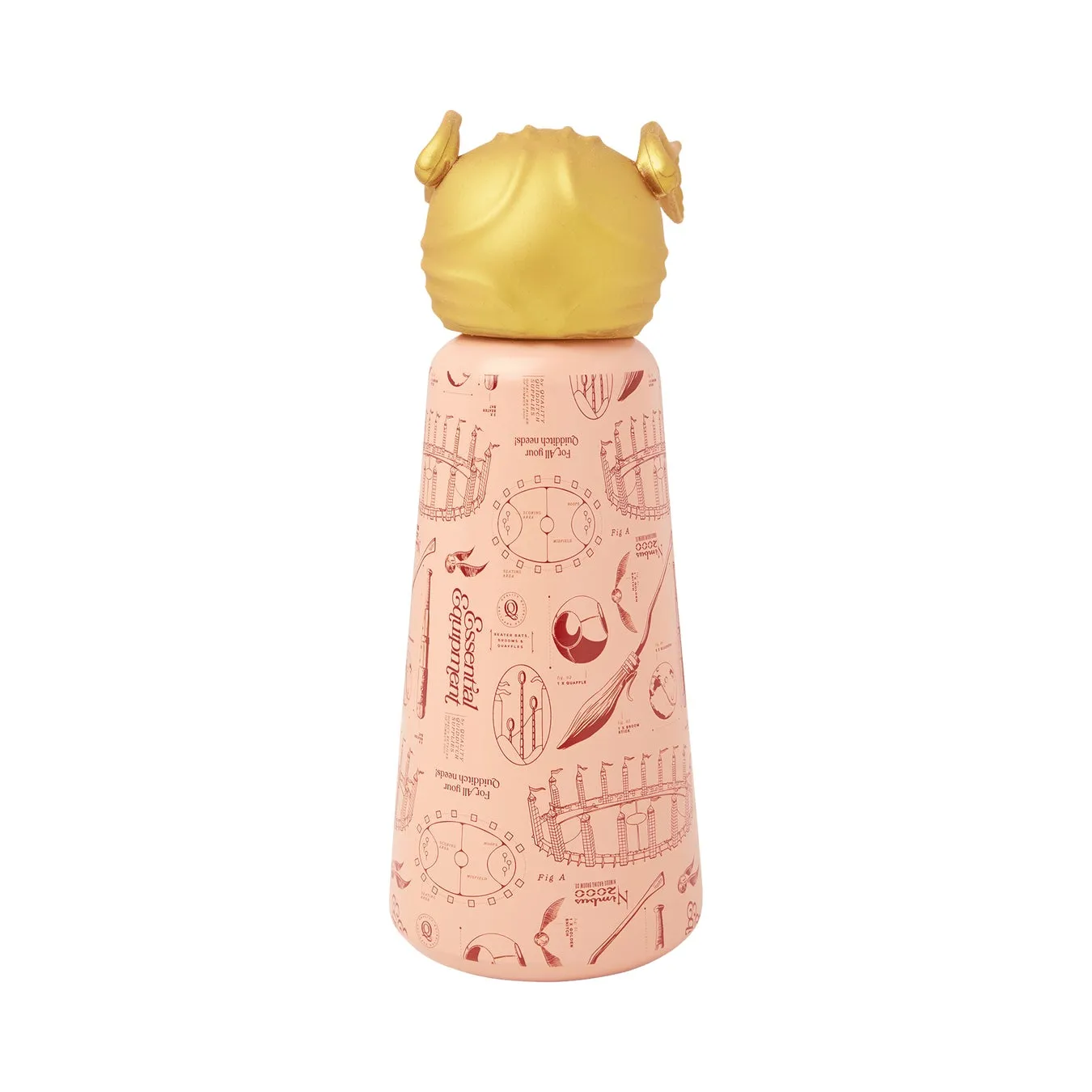 - 特徴: クィディッチのピッチ図や用具のディテール、戦術図がボトル全体にプリントされた、ファンにはたまらないデザイン。そして何より、蓋の上には立体的な金のスニッチが!羽のディテールまで細かく再現されたメタリックゴールドのスニッチは、まるで本物がボトルに宿ったかのようです。観戦の日も日常の外出も、これ一本でクィディッチの高揚感を感じられます。