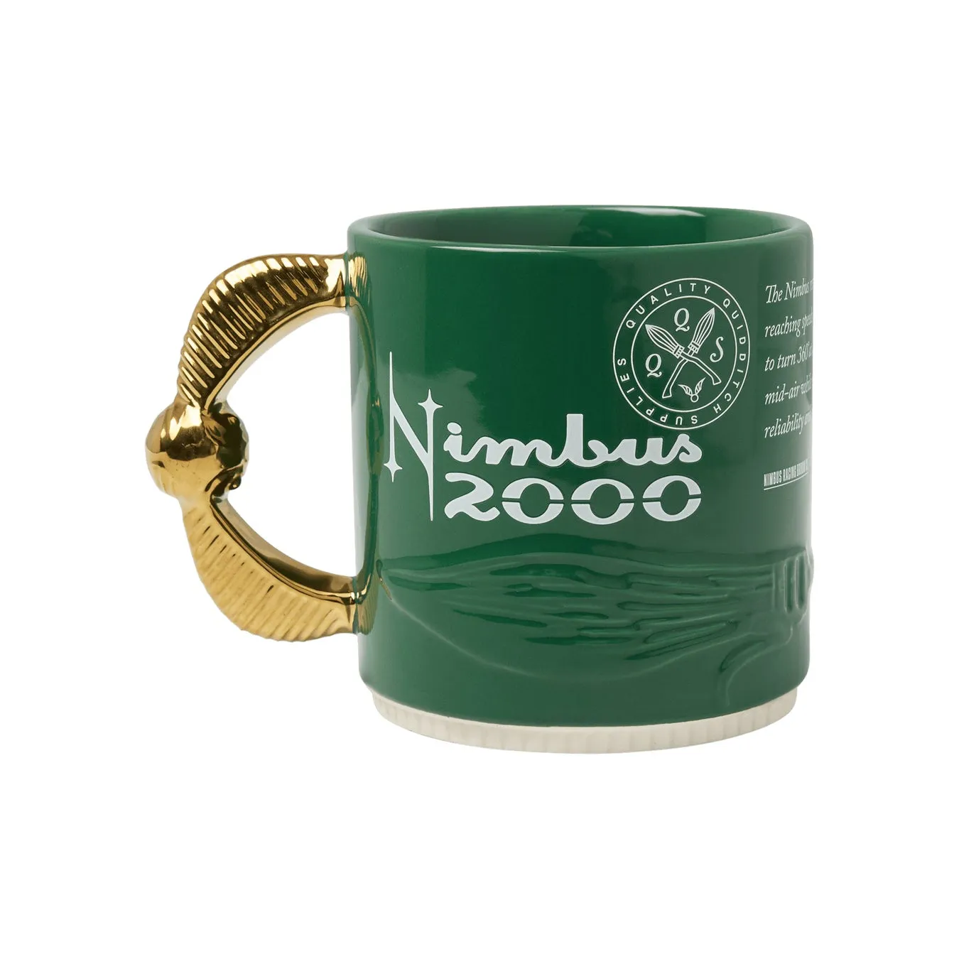 - 特徴: 深みのあるグリーンにピッチ図やスタジアムを思わせる図面風デザイン、そして「ニンバス2000」の文字。極めつけは、金のスニッチを模した立体ハンドルです!羽まで細かく再現されたメタリックゴールドの輝きは、コーヒーを飲むたびに「スニッチを追いかける瞬間」の高揚感を思い出させてくれます。朝の目覚めが楽しくなりそうですね。
