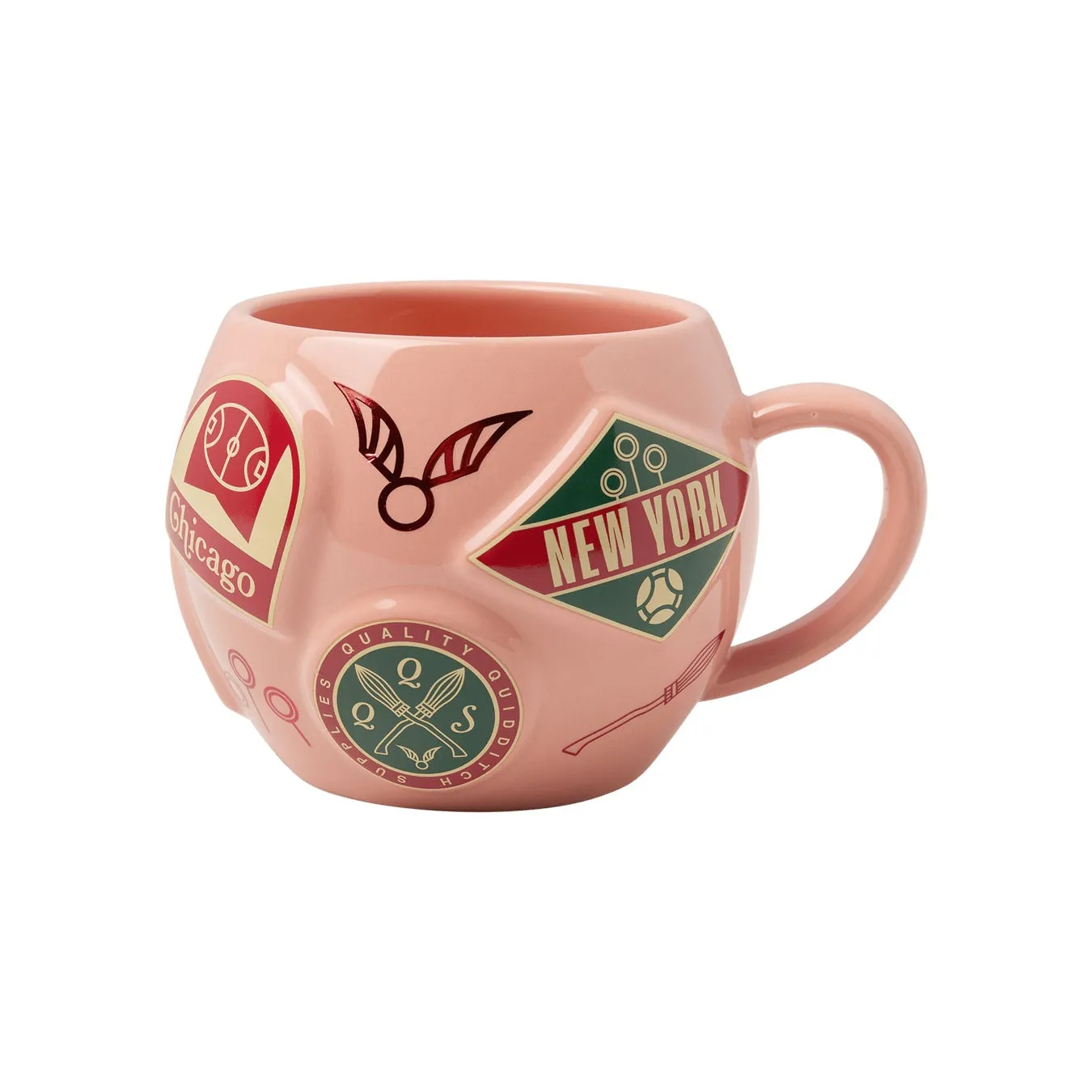 - 特徴: やわらかなピンクと丸みのあるフォルムがキュートなマグカップ。ロンドン、ニューヨーク、東京、シカゴといった世界のクィディッチ拠点を表現した立体バッジがあしらわれ、各地の記念品のような存在感を放ちます。ニンバス2000のモチーフも取り入れられ、複数の都市デザインを並べて飾るのも素敵です。