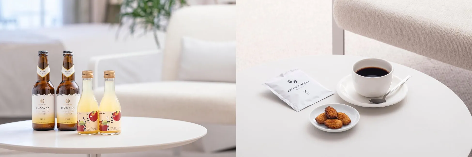 客室内でのサービス: 群馬産フルーツジュース、クラフトビール、水、ザ・パティスリーのオリジナル焼き菓子、ONCA COFFEEの白井屋オリジナルブレンドコーヒーが用意されています。