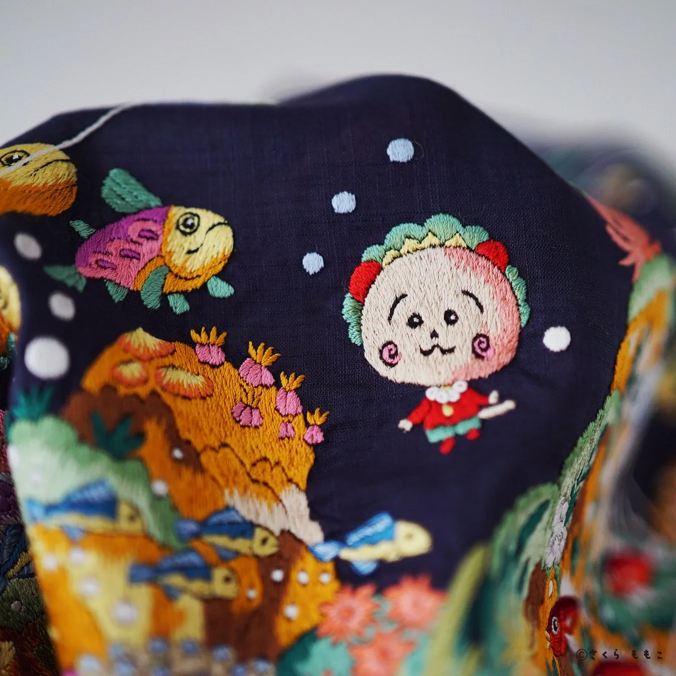 水槽の中でコジコジが魚と一緒に泳いでいる様子が、やかん君とペロちゃんによって外側から覗かれています。 24色の刺繍糸と多彩なステッチ技法を駆使し、ユーモラスかつ繊細にコジコジの世界観が表現されています。