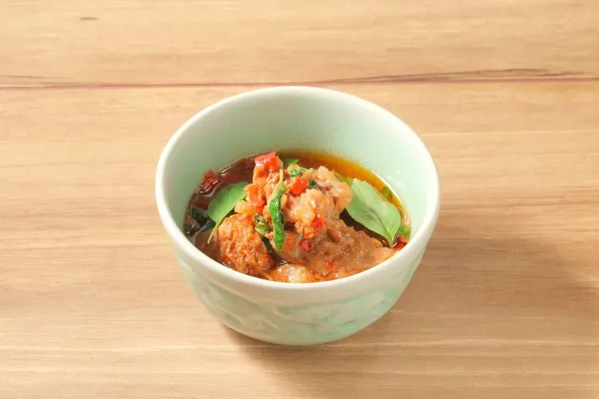 注目すべきは、千葉県市原市の自社農場「スースー・アグリ」で育ったフレッシュなタイの赤唐辛子(プリックデーン) やバイガパオ(ホーリーバジル) が惜しみなく使われている点。一口食べると、ハーブの力強い香りがふわっと広がり、その後に続く豚なんこつのコリコリとした食感と、上品な脂の甘みがたまらないハーモニーを奏でます。