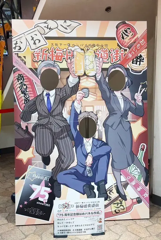 新梅田食道街1F女神広場に、75周年記念の顔はめパネルが設置されています。友人や家族と、楽しい思い出の一枚を撮ってみてはいかがでしょうか?