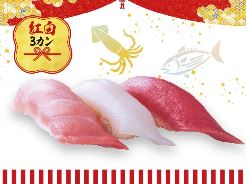 新年にふさわしい**本まぐろ大とろ、いか、本まぐろ上赤身**を組み合わせた「紅白3カン」。その名の通り、赤と白のコントラストが美しい、華やかな握りです。年迎えの席を彩るにはぴったりで、見た目も味も楽しめます。